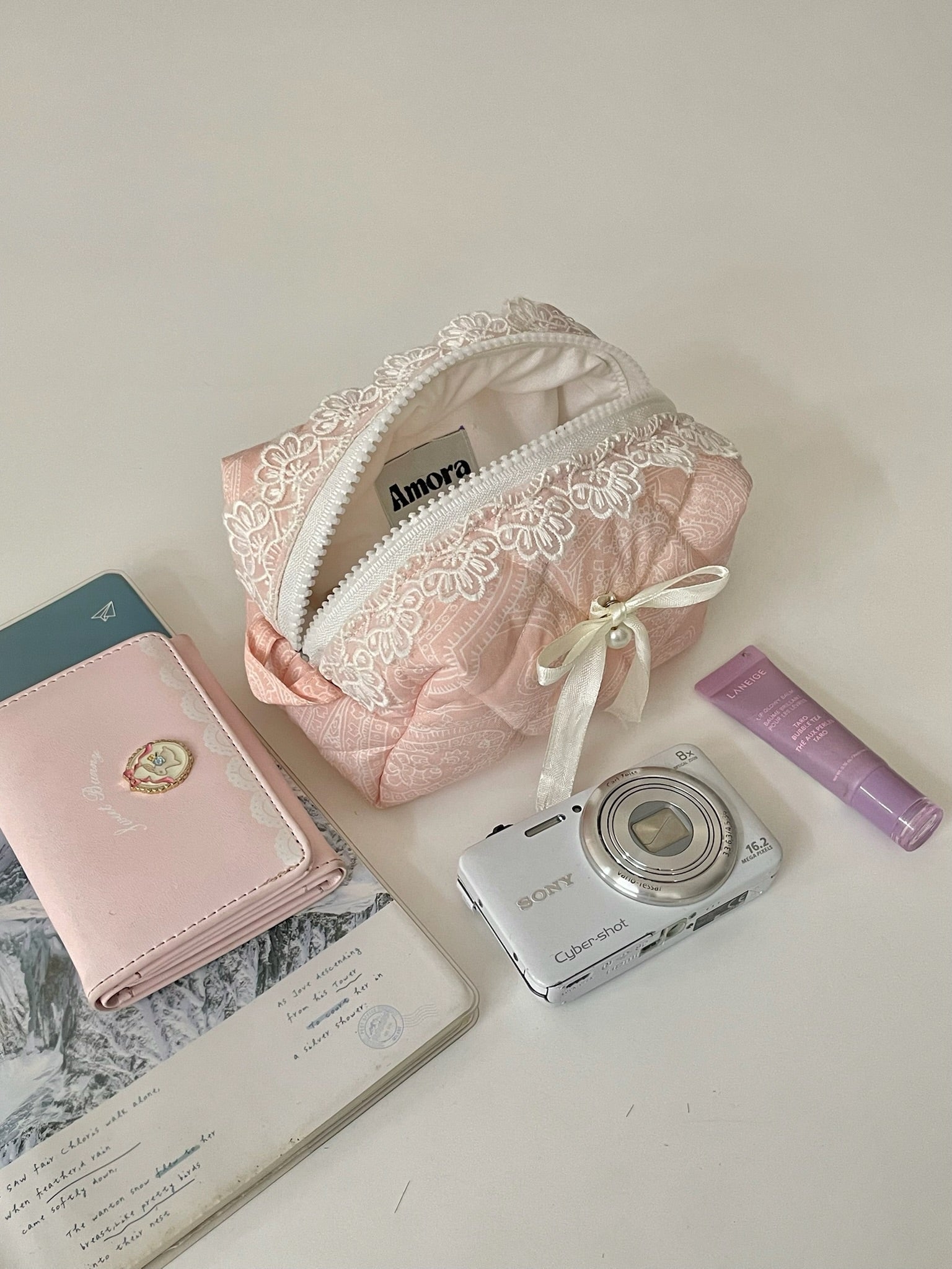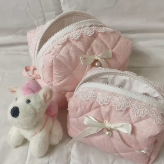 Made from premium quilted cotton and finished with lace trim, a satin bow, and a pearl charm. Soft inner lining keeps essentials protected while maintaining the pouch’s shape.